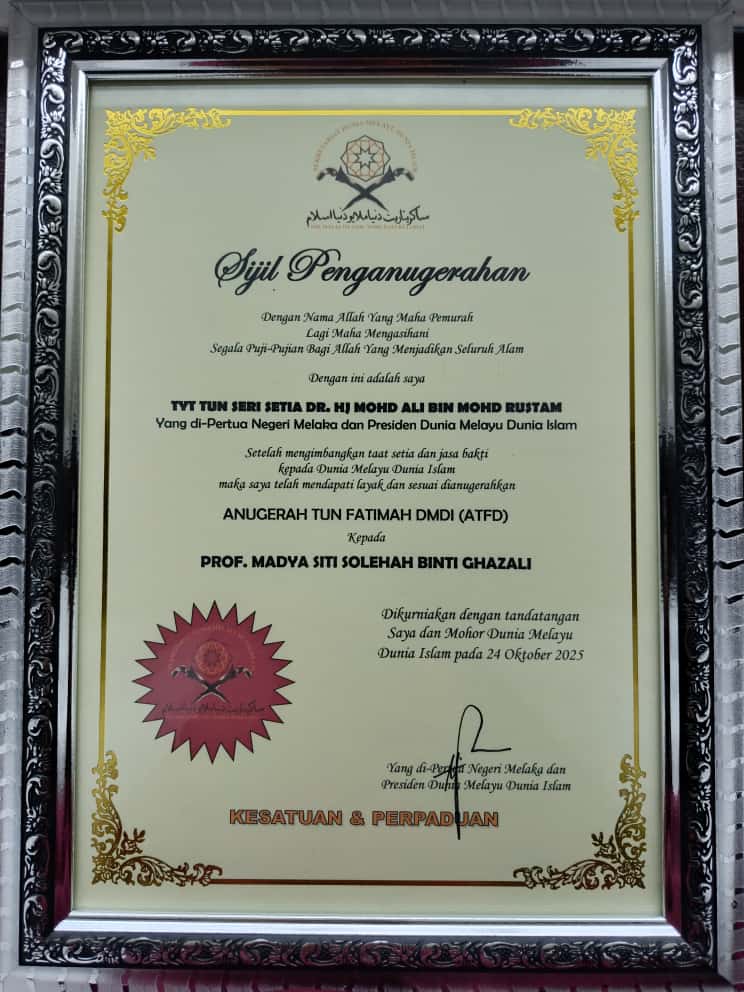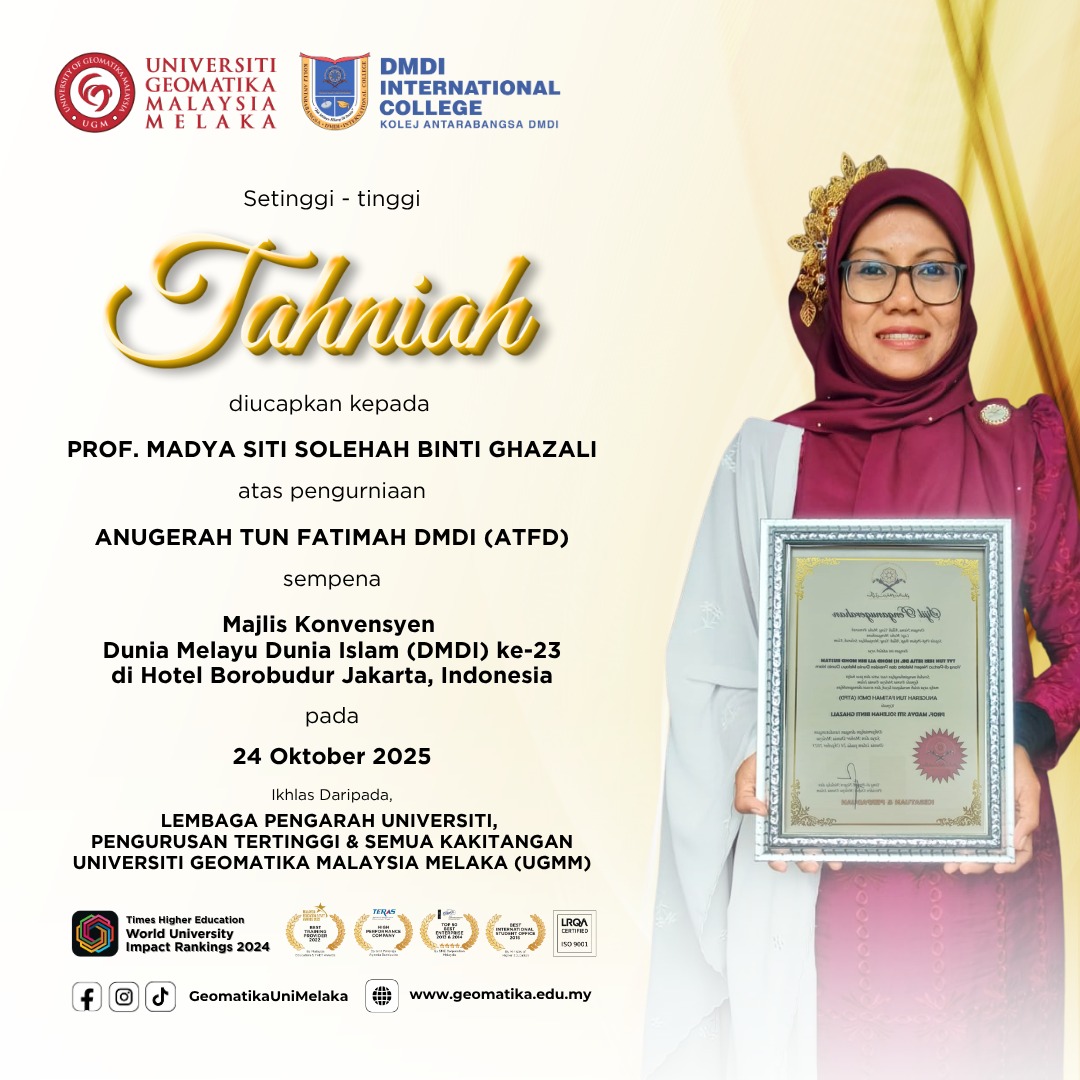 Universiti Geomatika Malaysia Melaka (UGMM) mengucapkan syabas dan tahniah kepada Prof. Madya Siti Solehah binti Ghazali atas penganugerahan Anugerah Tun Fatimah DMDI (ATFD) sempena Majlis Konvensyen Dunia Melayu Dunia Islam (DMDI) ke-23 di Hotel Borobudur Jakarta, Indonesia.